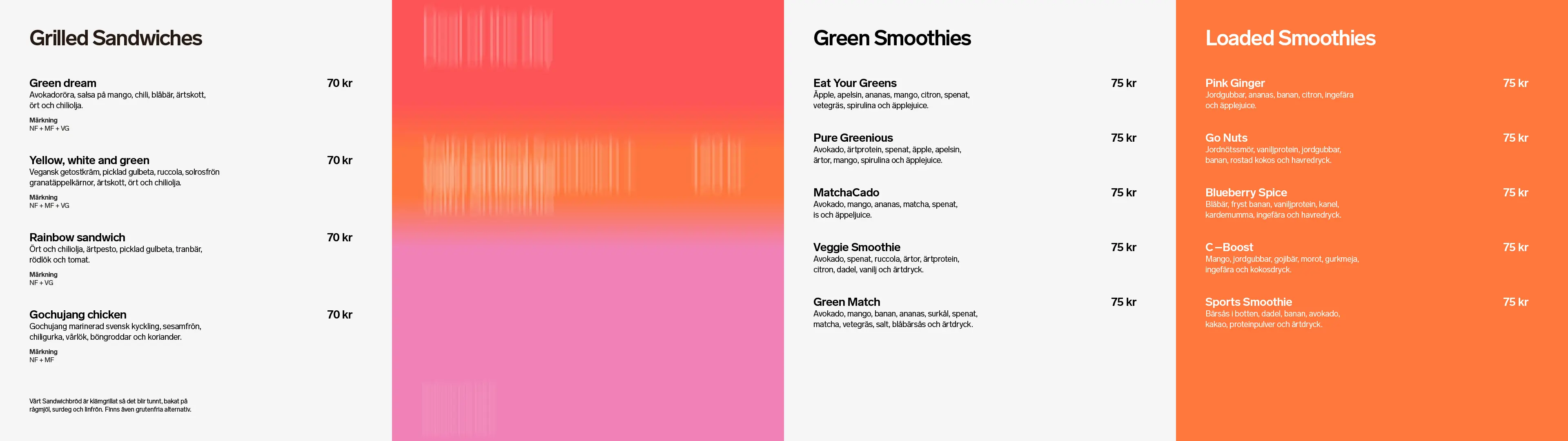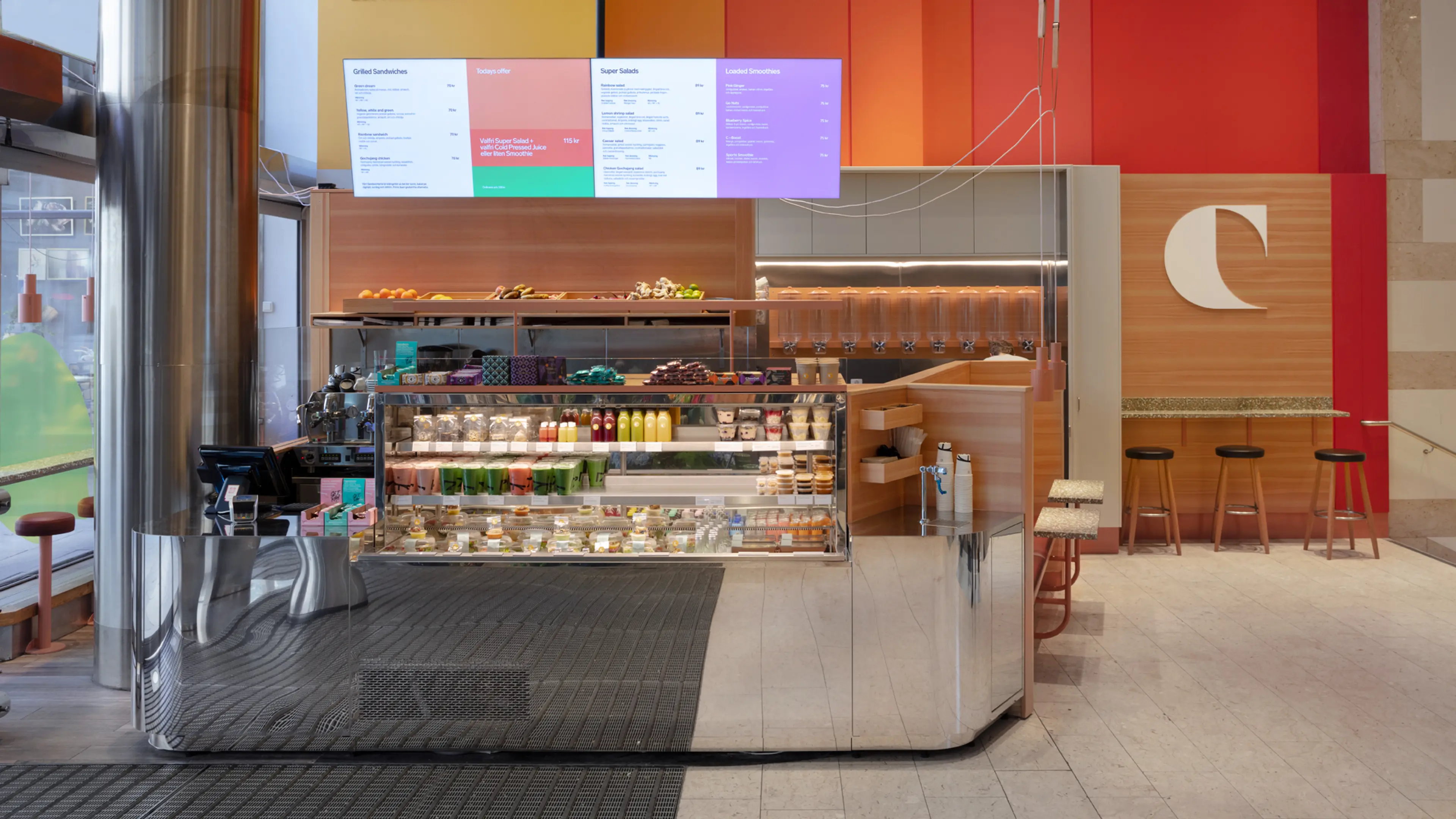 From brand name through to retail interiors, packaging and menu displays. Fields of color define the presence and is even used as a feature to determine the content of specific products.