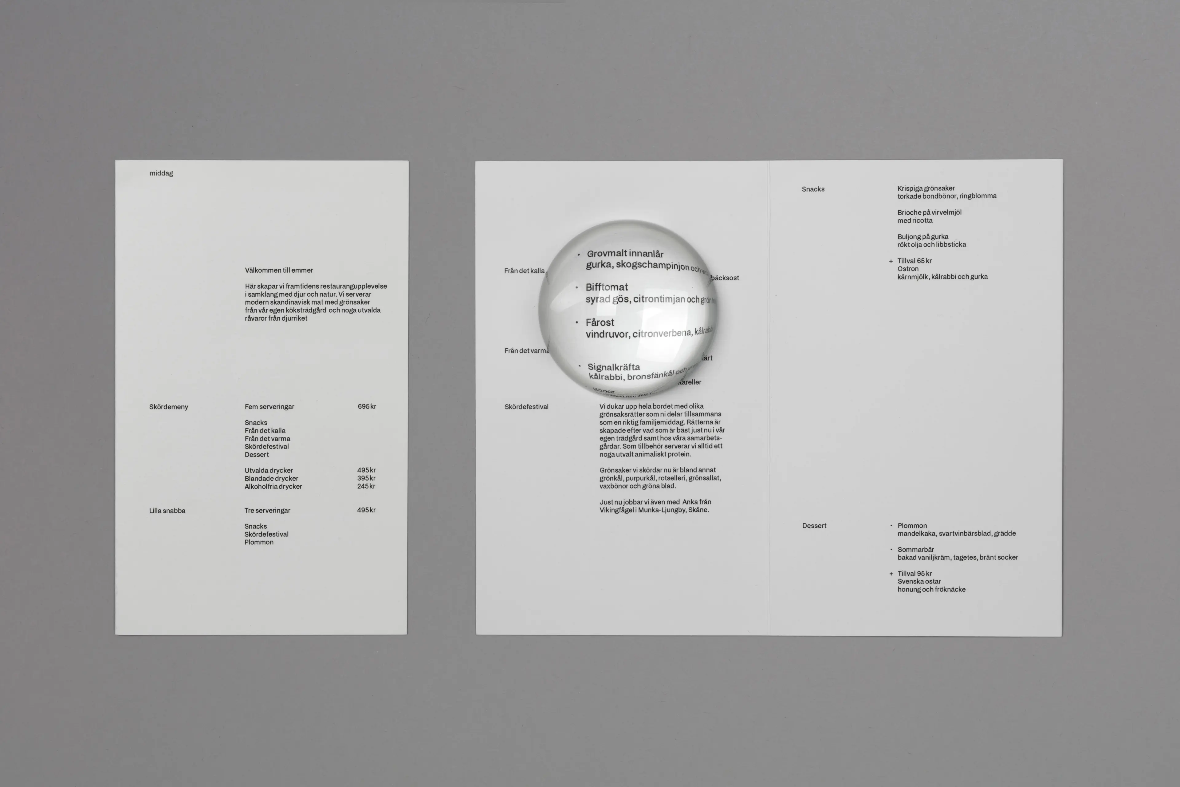 Ulriksdals Värdshus is a sweet spot. Only a stone’s throw away from Stockholm’s inner city, you will find a restaurant surrounded by forest, sea and cultivated land. The owners, Svenska Brasserier, had an ambition to change and modernize the traditional Swedish inn into a greener, simpler and more sustainable concept. The answer became Emmer – a restaurant with truly locally produced crops, serving modern Scandinavian food in a relaxed environment close to nature, and with the aim to attract a new conscious target group. Here, the cultural historical heritage meets locally produced food and the dream of a more sustainable future. The visual concept for Emmer draws inspiration directly from outside – the garden’s plantings, the origin of the food and the cycle of nature – from the magical seeds, which spread with the wind, interact with water – and grow. We imitated the elements, the wind and the rain, and the visual identity resembles nature itself; playful, whimsical, colorful and organic.