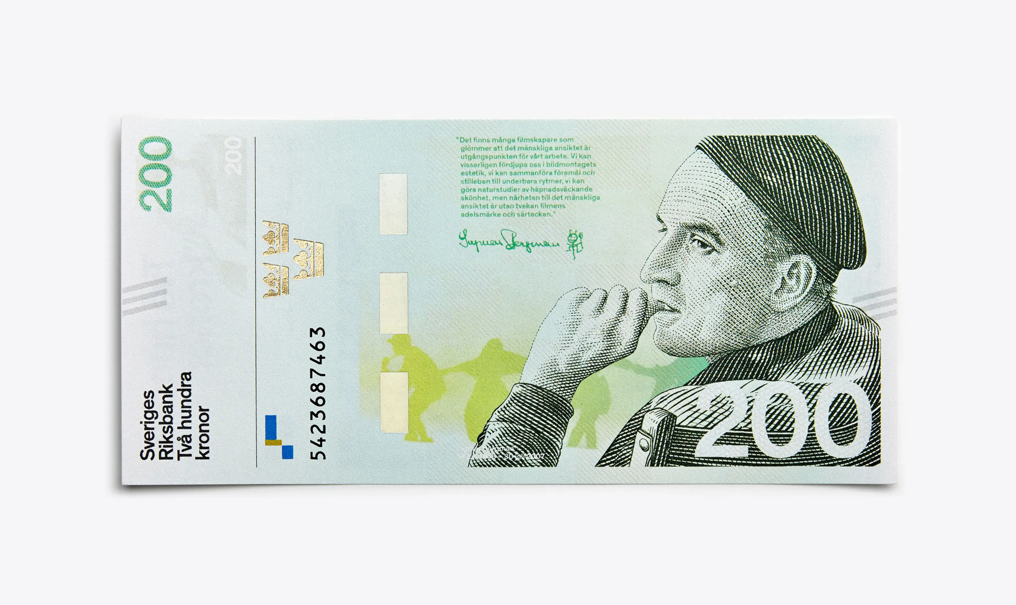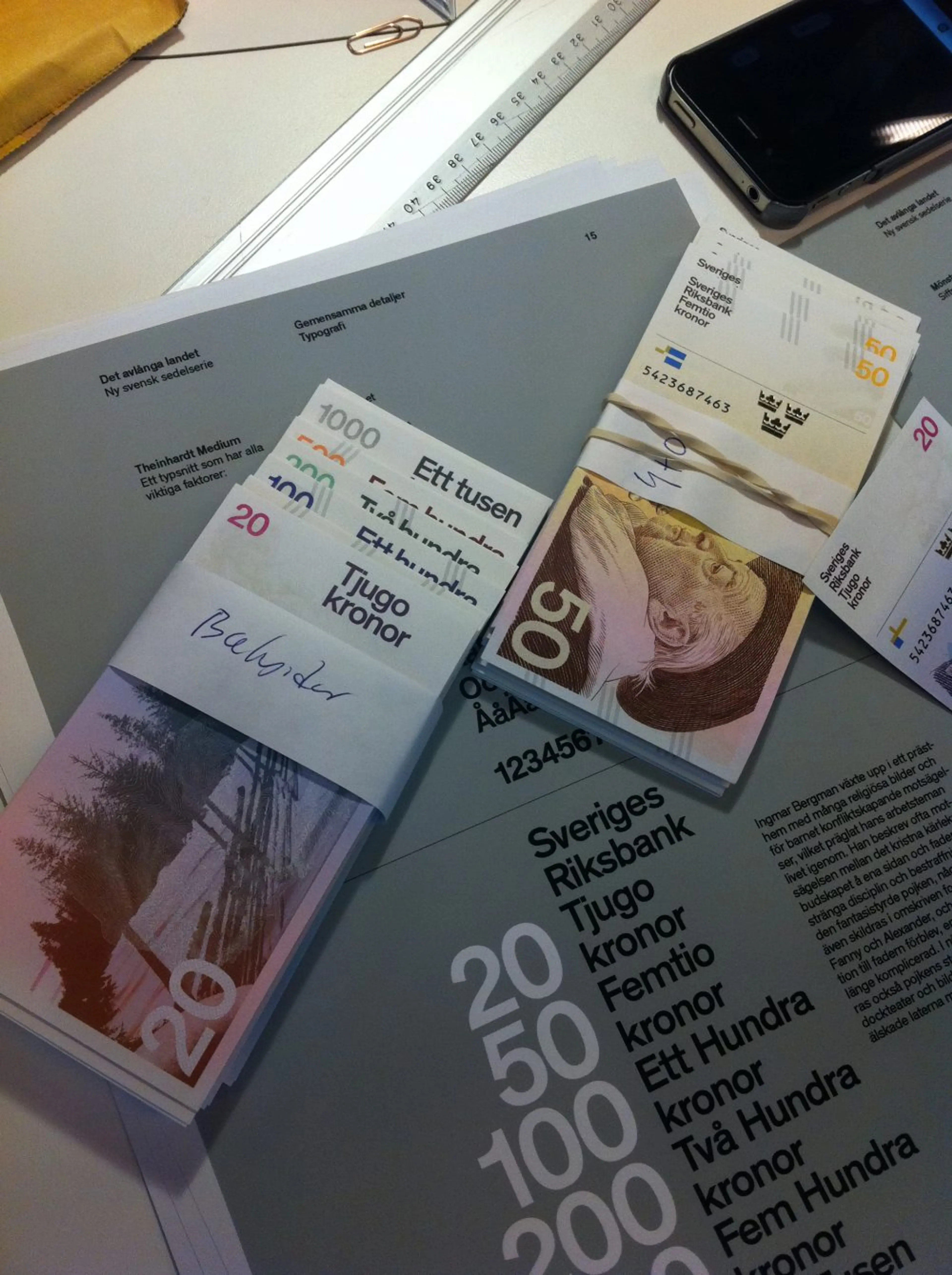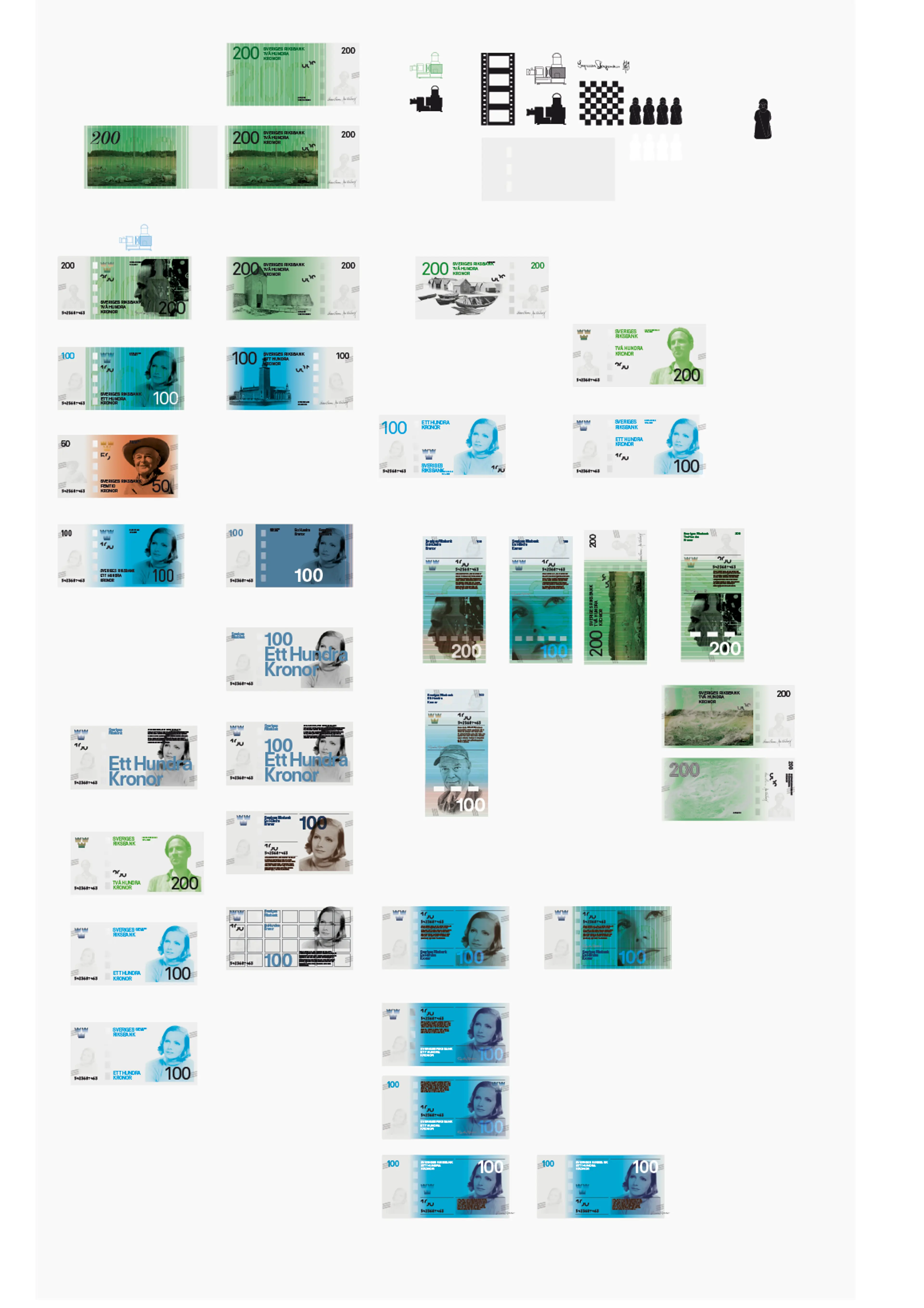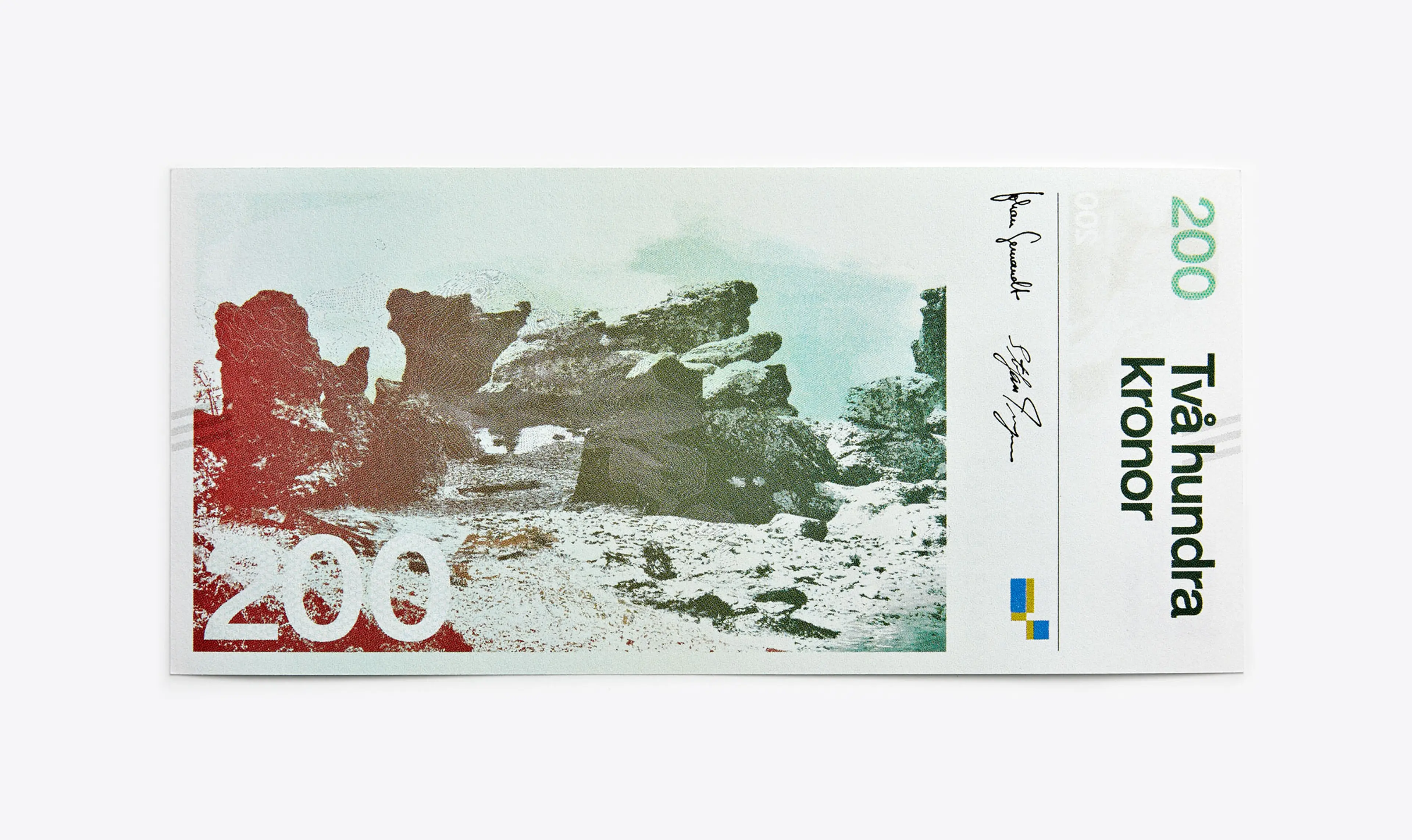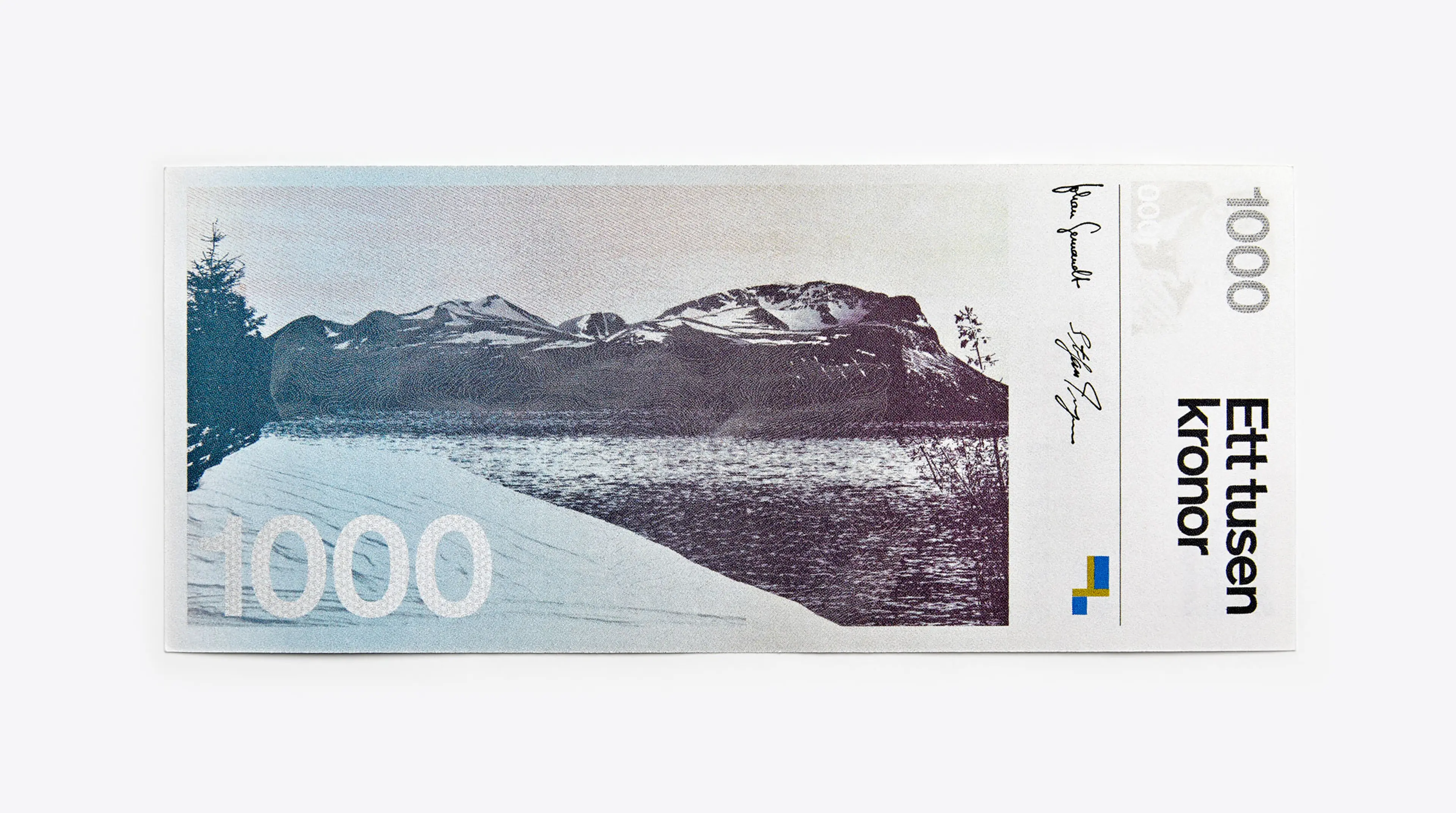 There are around 340 million banknotes in circulation in Sweden. The series of 20, 50, 100, 500 and 1000-krona notes was designed at the end of the 1980s, before current banknote security features were what they are today. In October 2015, the Sveriges Riksbank introduced a new set of Swedish banknotes to equip its currency with state-of-the-art protection against banknote forgery. For SDL, it was a once-in-a-lifetime opportunity to design something that would tell a story for millions, that every adult Swede would have in their hand every day. With this in mind we entered a competition along with 48 other studios, artists and illustrators. We tried many variants on the traditional banknote, including a vertical format, printing techniques, collage techniques, alternative placements of the security features, and different styles of portraiture. The set of designs we submitted struck a balance between tradition and modernity, with engravings by Martin Mörck and modern, sans serif typography and a series of landscapes that, when the notes were placed end-to-end, formed a journey through Sweden’s countryside with a single, unbroken horizon.